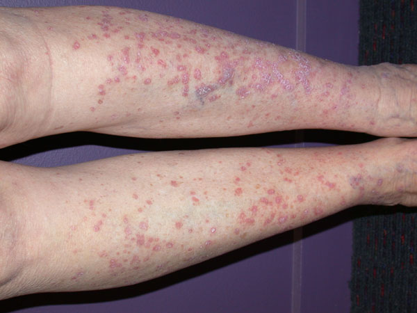 Η τυπική εικόνα χαρακτηρίζεται από ερυθρο-ιώδεις βλατίδες, πολυγωνικές με έντονο κνησμό. H επιφάνεια των βλαβών είναι ξηρή, καλύπτεται από λιγοστά λέπια και φέρει λεπτές λευκές γραμμές το λεγόμενο δίκτυο “wickham”. Τα πιο συχνά σημεία εντόπισης στο δέρμα είναι η καμπτική επιφάνεια των καρπών, το έσω τμήμα των μηρών, οι κνήμες, ο κορμός και η βάλανος.